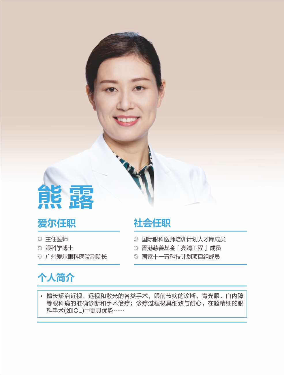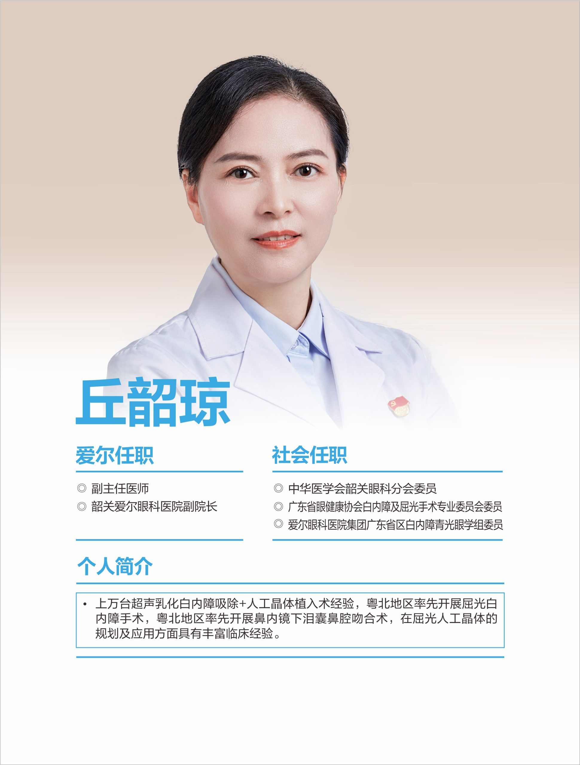 韶關(guān)愛爾眼科醫(yī)院有限公司白內(nèi)障團(tuán)隊(duì)擁王愛琴院長(愛爾眼科粵北區(qū))、丘韶瓊院長、郭俊豪主任等多位專科醫(yī)生,具備同步國際的白內(nèi)障手術(shù)能力,能熟練開展各項(xiàng)常規(guī)及疑難白內(nèi)障手術(shù)。 可開展微切口煥晶白內(nèi)障手術(shù),植入多焦晶體或多焦+散光矯正晶體,在治療白內(nèi)障同時同步解決遠(yuǎn)視/近視、老花眼、角膜散光等屈光問題,醫(yī)生手術(shù)經(jīng)驗(yàn)豐富,為眾多患者帶來更舒適的視覺。